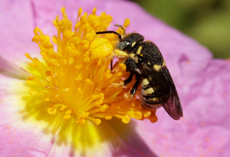 Kleine harsbij, (Anthidiellum strigatum) Kavaki Lesbos Griekenland 15-5-2025. /