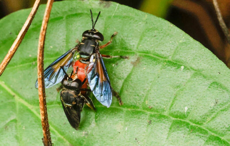 Zweefvlieg (Peradon angustus) vr. mannetje is een andere soort of hij komt in 2 kleurvormen voor. (wordt aan gewerkt) Peperpot distr. Commewijne Suriname 28-1-2026.