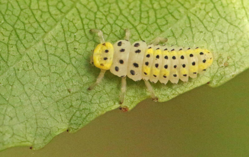 Larve Citroenlieveheersbeestje, (Psyllobora vigintiduopunctata) lekdijk-west Wijk bij Duurstede 18-6-2024. 6a
