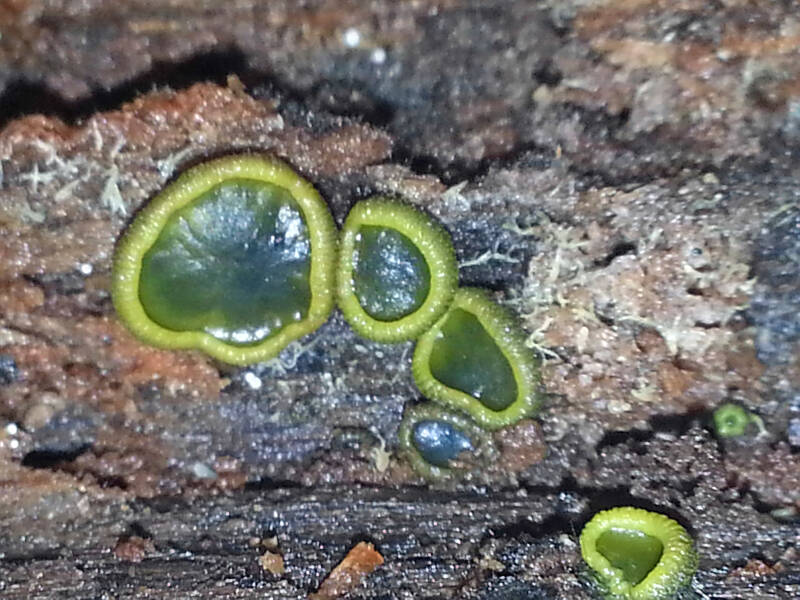 Groen franjekelkje (Aeruginoscyphus sericeus) Rheden 14-10-2017. Z 8