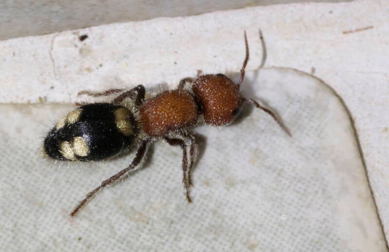 Vleugelloos vrouwtje van de mierwesp (Mutilla quinquemaculata). Anaxos Lesbos Griekenland 13-5-2025. /